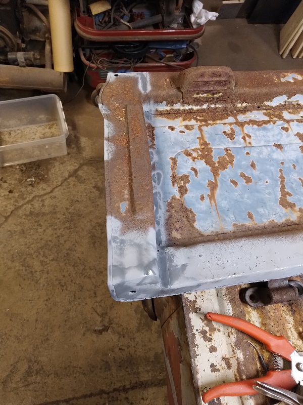 Med den biten avklarad så var det dags att rensa de gamla gångjärnen från rostrester och sedan göra nya förstärkningsplåtar enligt original.