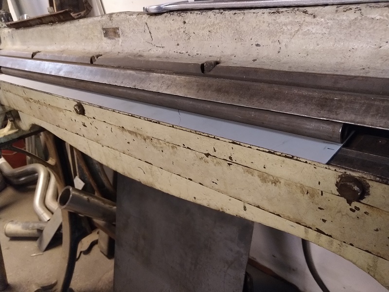 Som ni ser på den ena bilden så är profilen inte helt självklar att göra. Vilken bock ska göras först? Hur får jag till den lite större rundningen? Jag insåg i alla fall att garagets plåtbock "bara" klarade av max 1M bredd, och eftersom innerbiten är 161cm så valde jag att göra dessa i två bitar, funderade först på att göra en kort och en lång bit, men slog bort den tanken när jag råkade hitta ett lämpligt 20mm rör för att få till den större rundningen För övrigt det enda 20mm rör jag hittade.