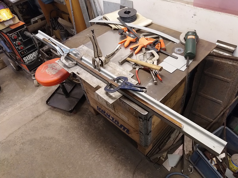 Eftersom den nya bottnen var i två delar så blev jag ju tvungen att svetsa ihop dessa till en lång bit. Klämde fast dessa mot mitt stadiga plåtbord med en aluminiumskiva emellan, samt att jag hade en rak fin stålbalk som extra trygghet för att få det så rakt som möjligt.