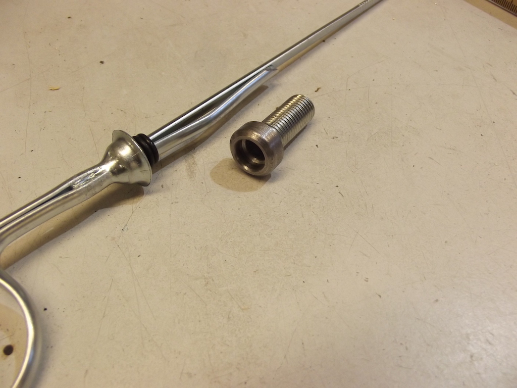 WBX-motorn har en lång oljesticka som löper i ett långt rör. Det passar ju inte bra för oss. Röret fanns inte med på mitt block och ingen sticka heller.