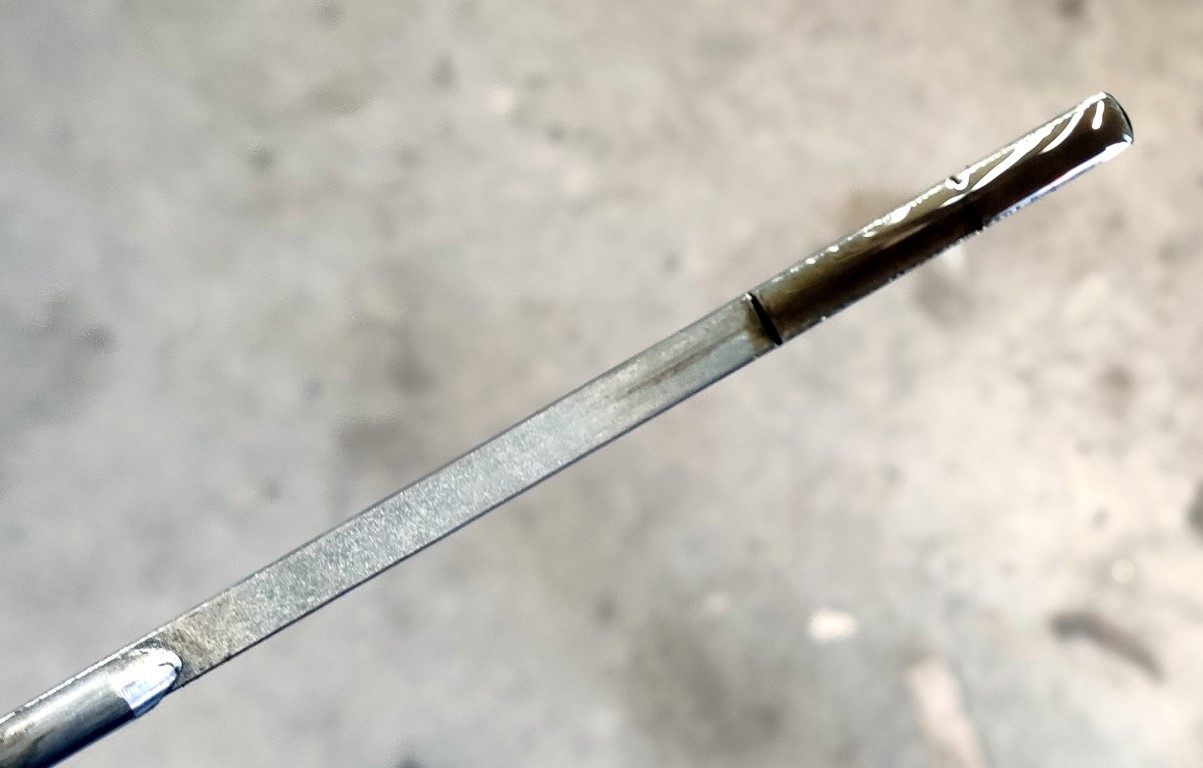 Då kollade jag nivån på oljestickan, och den var ca 5mm öve röverst strecket´.