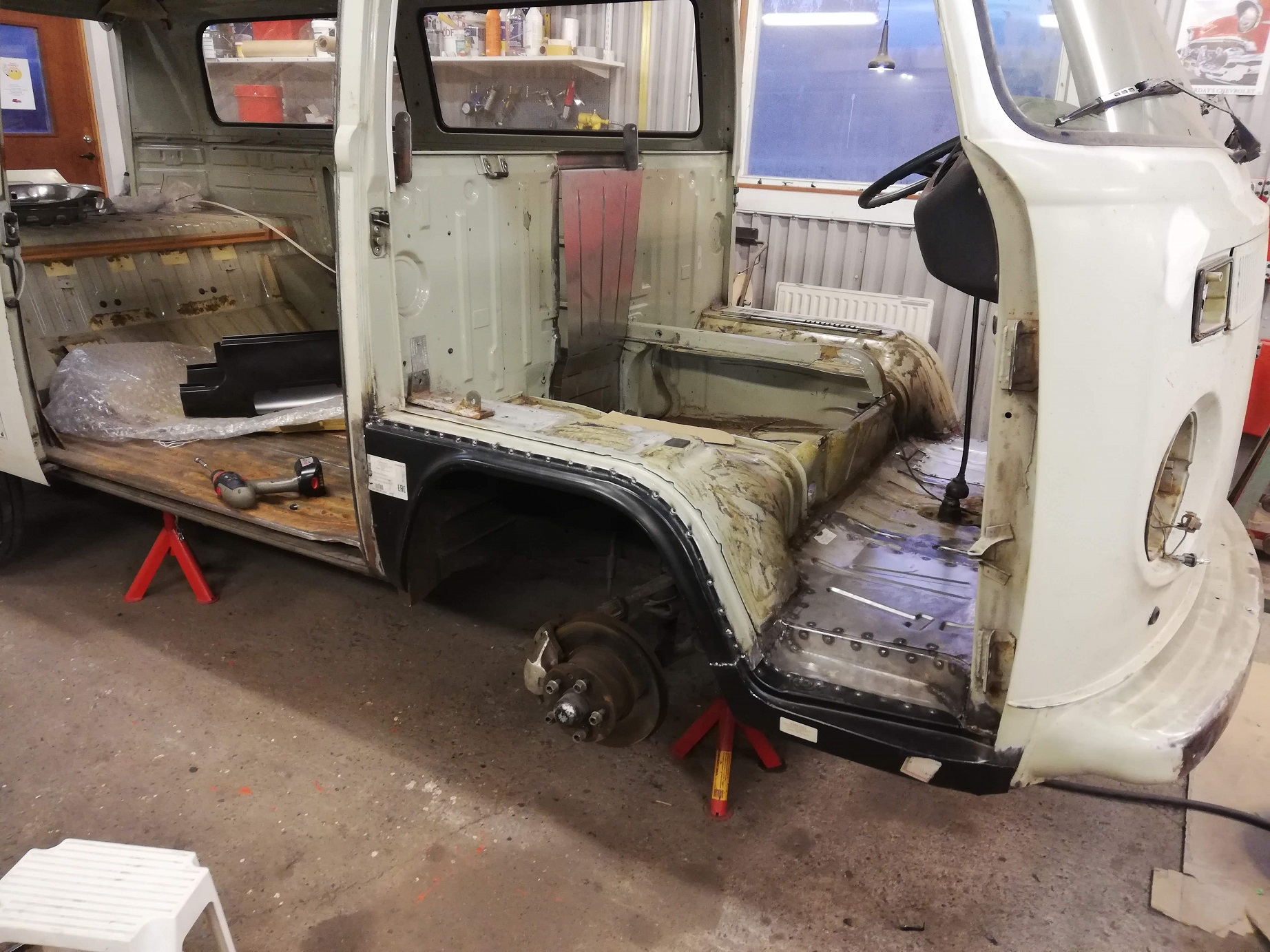 Lite bilder från när jag hämtade bussen! Den groteska campinginredningen gjord av masonit och OSB plywood är bortkastad för utbyte mot en kommande westfaliainspererad inredning. Av någon anledning hade även gamla ägaren satt dit en early bay skärmkant och dessutom helsvetsat sömmen på passagersidan.. Detta är självklart åtgärdat nu.