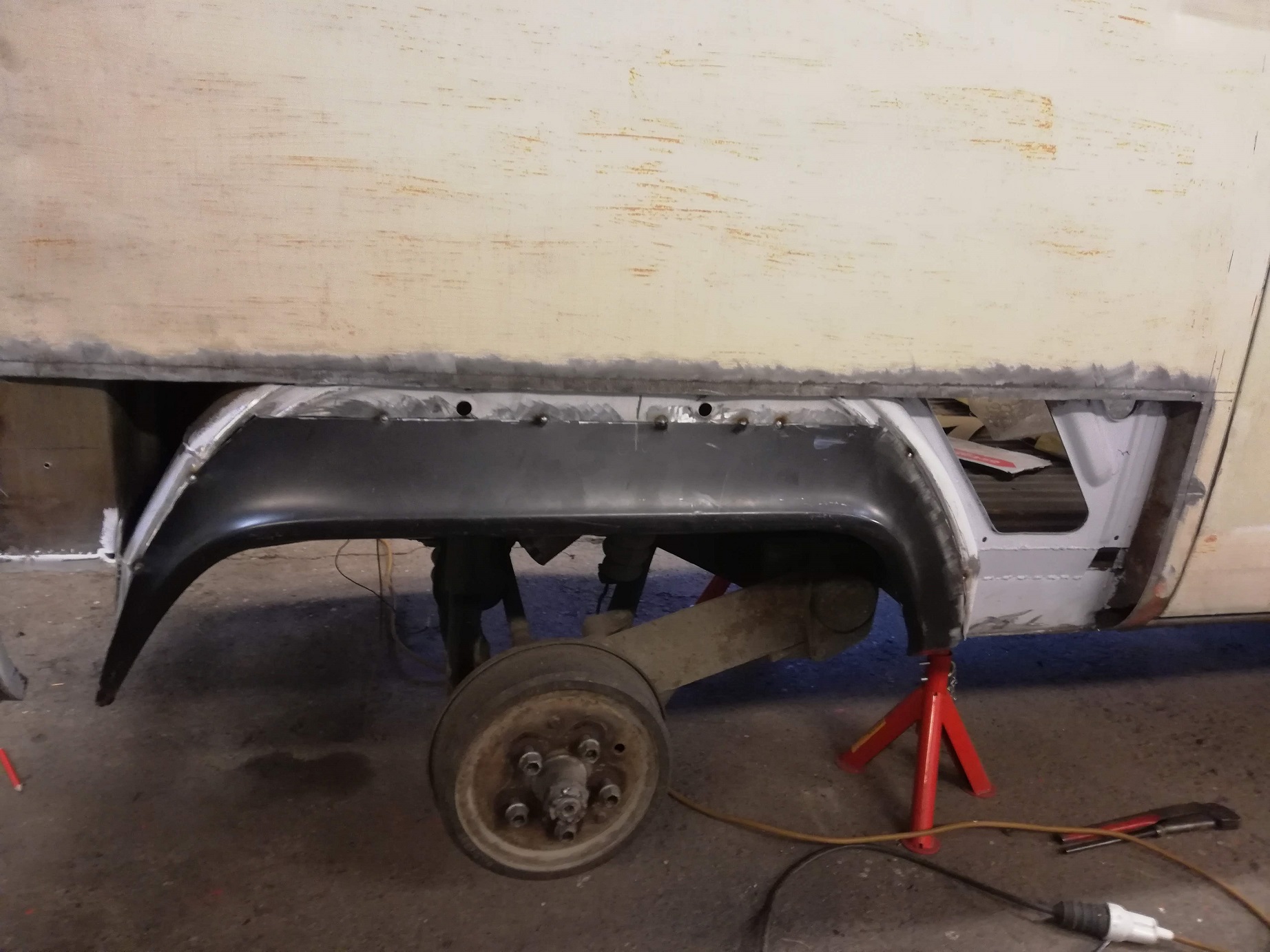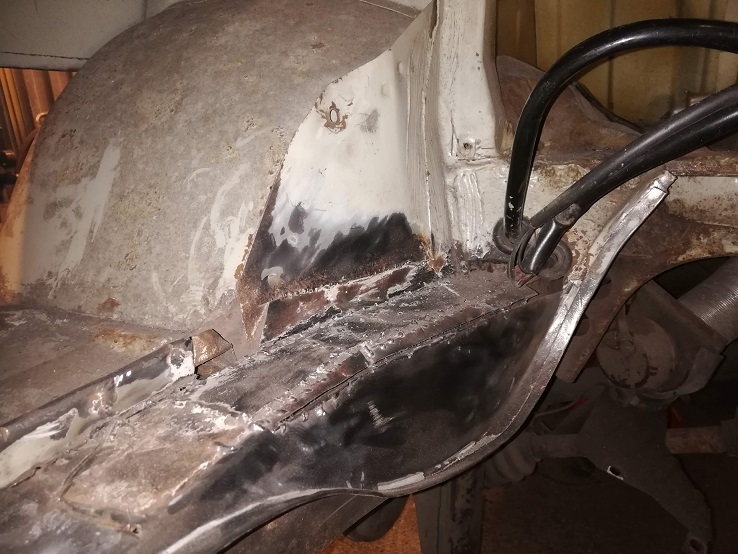 Såhär blev slutresultatet på innerskärmarna. Märkte även här att jag skulle ha maskerat ytorna där limmet ska appliceras då jag före jag började slipa läste om att epoxiprimer INTE får slipas när det är ohärdat då det finns en risk för allergen chock vilket jag helst slipper (väl medveten som sjuksköterskestudent vad detta innebär). Med 7 dagars härdningstid på Hagmans ca primer åkte jag iväg hemåt då jag studerar på annan ort och nu ligger bussprojektet vilande en stund till. Blir dock att åka upp på ungefär 2 veckor och fortsätta i och med covid 19 och distansstudier. Postar även en trevlig lagning av någon tidigare ägare i motorrummet som ska åtgärdas ICQ/ai
