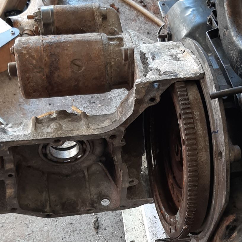 Tack för tipset ang vinkelslipen. Jag funderar på att tömma den på innehåll, behålla halvan med startmotorfästet samt karva ur på de ställen där svänghjulet tar emot.
