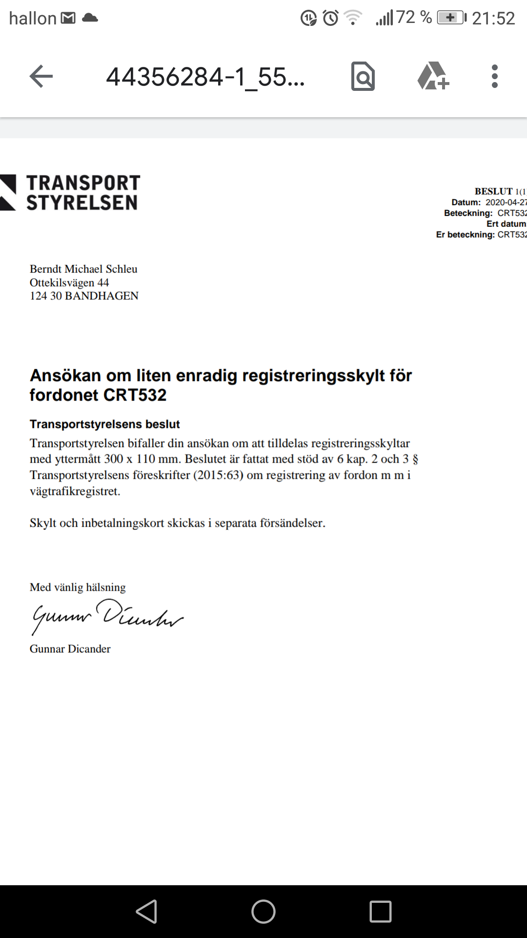 Mera positiv är det här beslutet jag fick från transportstyrelsen. ICQ/bp