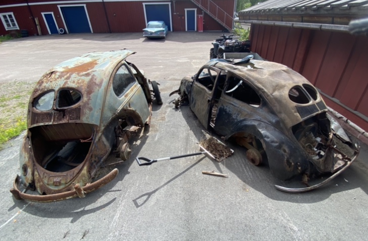 Hej, Jag vet inte vart man ska posta bytesförslag men testar här så får ni rätta mig. Jag har två stycket split bubblor som är hämtade skogsvrak. Jag har hämtat båda två själv. Den ena har jag vidimerade handlingar från riksarkivet på så den är klar att söka ursprungskontroll på och kan då reggas med orginalhandlingar. Men båda två är ganska hårt tagna och den ena är karossen delad på men om man använder sig av båda två tror jag man kan få till en bil. Plus att man får en massa bra delar kvar. Jag skulle tro att båda är 51:or då båda har ichias luckor. Med den det finns papper på är registrerad som 1950 från start. Regplåt finns till den andra men jag klarar inte av att tyda den. Men om man är ihärdig kan man kanske få fram papper på den också.