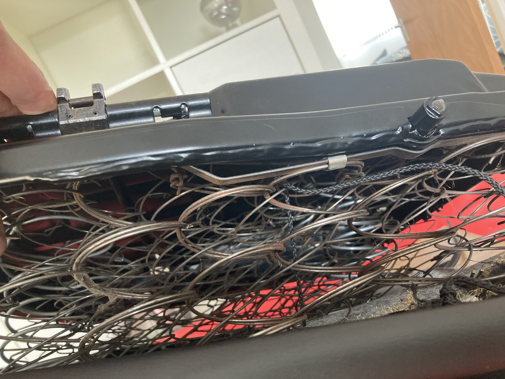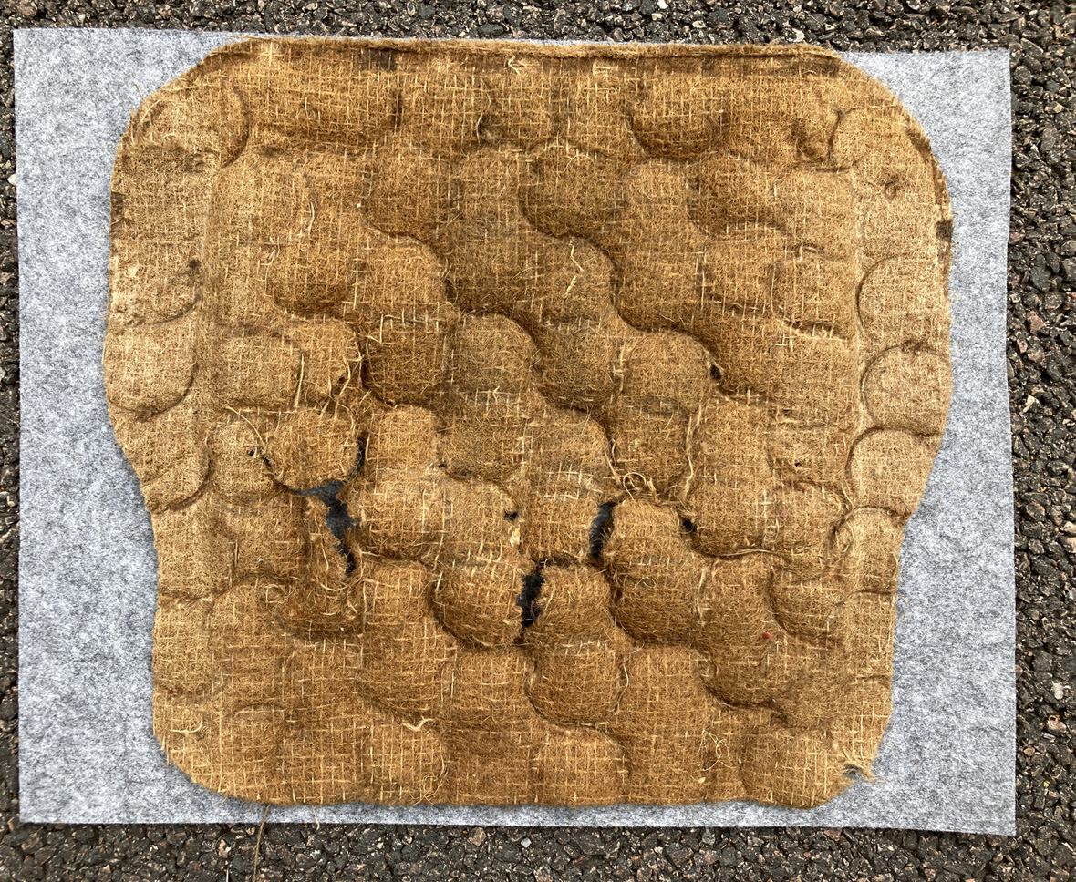 Sedan sitter det en dyna fäst på metallkonstruktionen. Den var ganska sliten på förarsidan så jag fick ersätta ett skikt där fjädrarna gått igenom. Jag använde 3 mm tjock filt som ni ser under den trasiga dynan.
