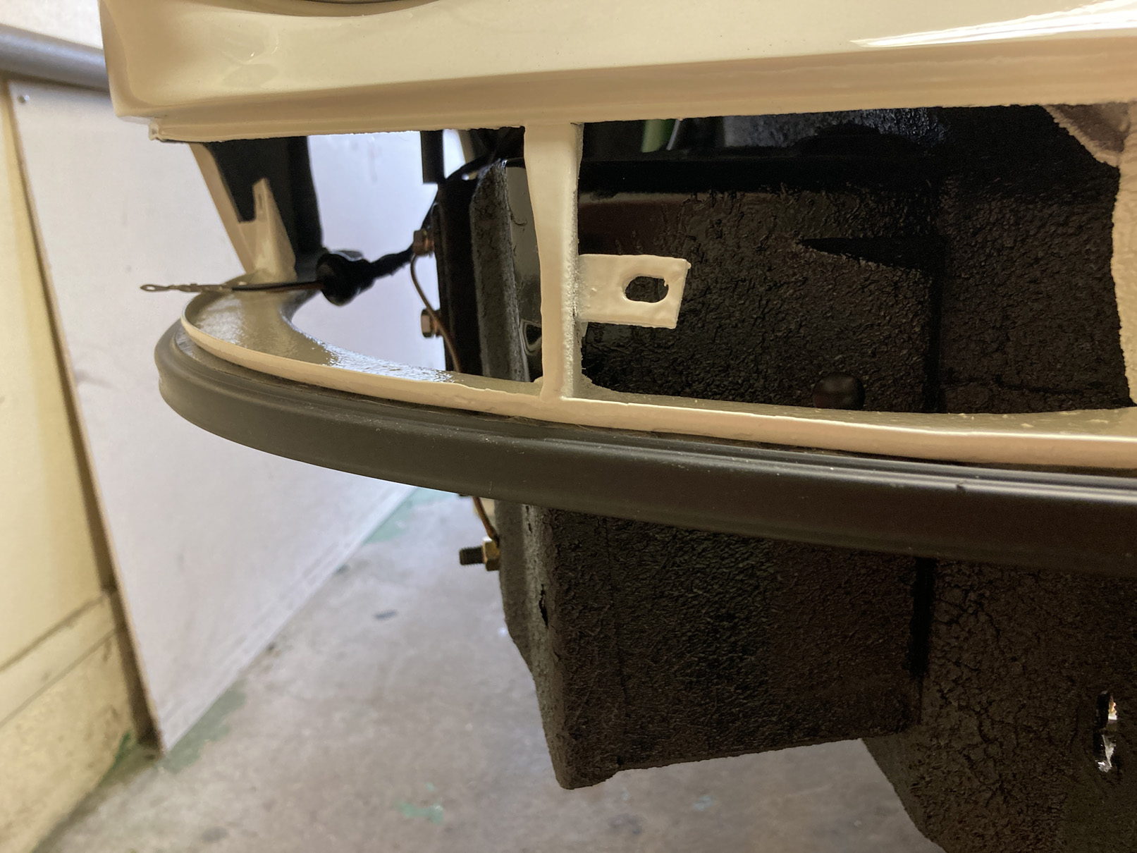 Strålkastarna är repro med original glas. Det ska ju in en tätning där också. Det får ju inte vara för lätt... Skar ur den icke synliga delen på gummilisten uppe vid fliken som håller hela strålkastaren (!) Fick massera kanten på skärmarna FÖRSIKTIGT! Markerade mittpunkterna och lite fram och tillbaka enligt principen ovan så sitter de också på plats. Dock så drog jag av låsskruven på ena sidan. Den var i rostfritt och otroligt skör! Skulle inte våga ha den som faktiskt är det enda som håller allt låst. Satte en vanlig skruv tills vidare och ska kolla vad det finns för alternativ. Kanske något VW?