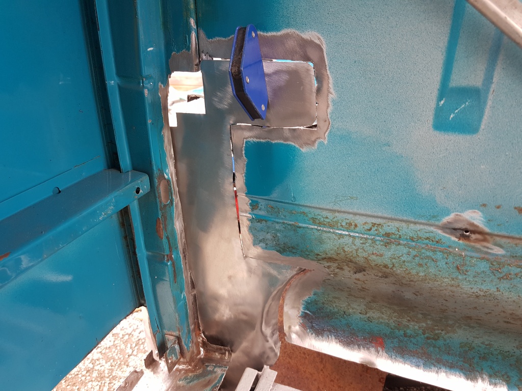 Sedan var det dags att tillverka en egen c-stolpe, då den inte går att köpa ny. Hade inte direkt något att utgå ifrån, så jag fick gissa lite, men det blev bra ändå, blev stark och den kommer inte synas då yttertröskeln sitter utanpå. Den ska slipas till lite och målas på insidan innan den kan svetsas på plats.