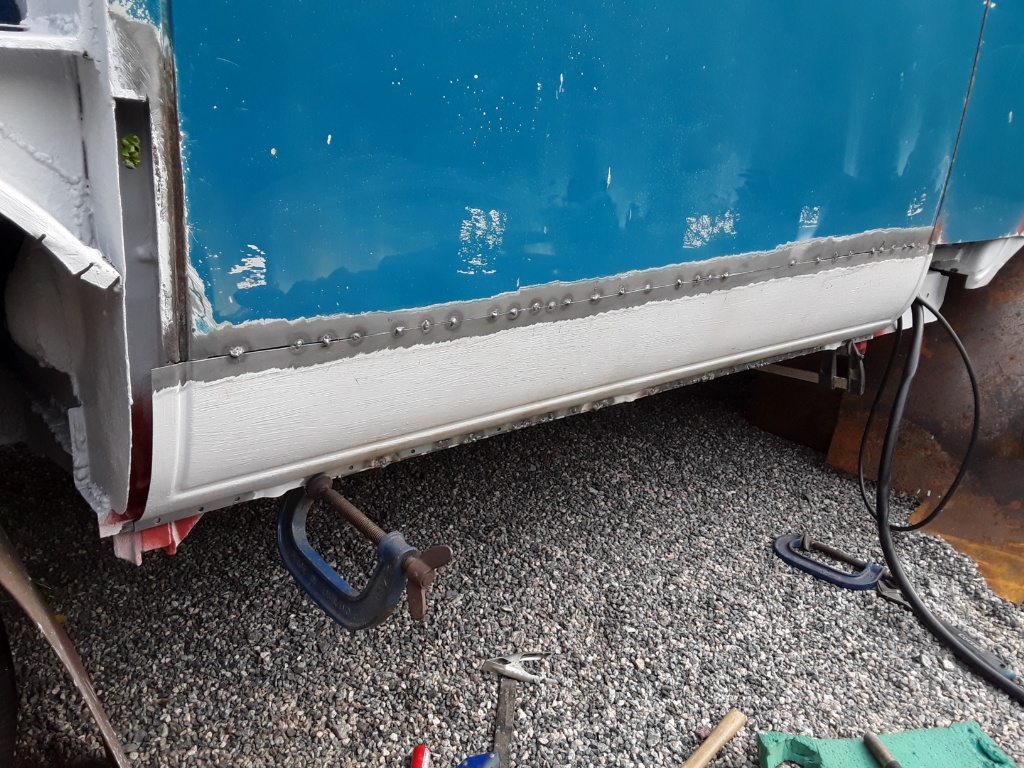 Sedan passade jag in plåten och punktsvetsade fast den. Jag har sett hur folk lagt plåten med överlapp och punktat och har även stett hur folk limmar för att plåten inte ska slå sig. Jag svetsade plåtarna kant i kant. Det tog otroligt mycket tid, hade svetsen på låg strömstyrka och svetsade rätt så snabba punkter, en längst fram, vänta tills det svalnat, sedan en längst bak, vänta, sedan en i mitten. Jag knackade även på svetspunkterna med en hammare emellanåt då jag läst att det kan bildas spänningar i dem annars som gör att plåten slår sig. Jag fortsatte punkta på detta sätt till dess att hela skarven var tät. Detta tog ca 7 timmars arbete, men så blev det bra också tycker jag. Plåten slog sig inte heller!