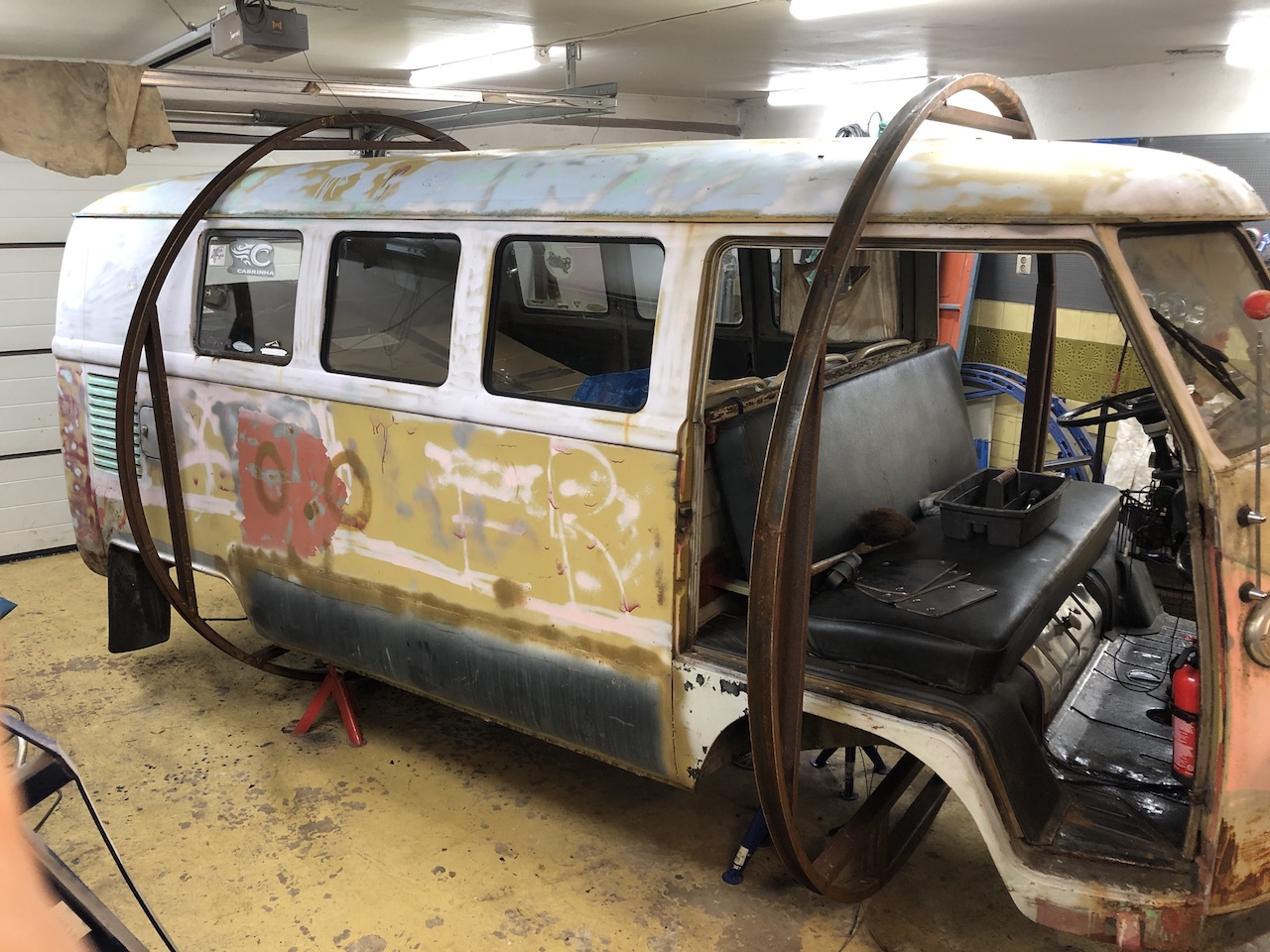 Vid sista besiktningen så tyckte dock besiktningsmannen att jag kanske borde svetsa upp framvagnens infästning och fixa en bättre styrsnäcka på en sådan trevlig vagn - och då bestämde jag mig för att det skulle bli en transmodifikation. Inspirerad av Mogge C skall nu bussen förpuppas i mitt garage och komma ut som ÄVENTYRSRAKETEN! Det ska lagas kick-upper och bytas golv och bakre hörnen ska nog få sig lite kärlek innan den får lite rollad eller garagesprayad färg. Nytt innertak och en POBA-liknande inredning och en ny mini-stroker-motor. Tanken är att bestycka med taktält och ge sig ut på nya äventyr. Följ med på resan!
