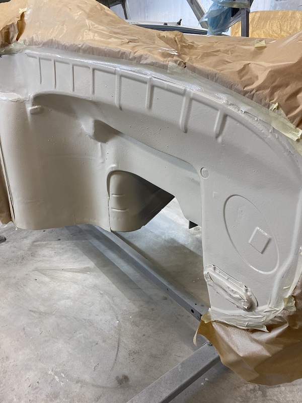 Efter jag smetat ett till lager Epoxy i hjulhusen och innerskärmar blev det ett lager body.