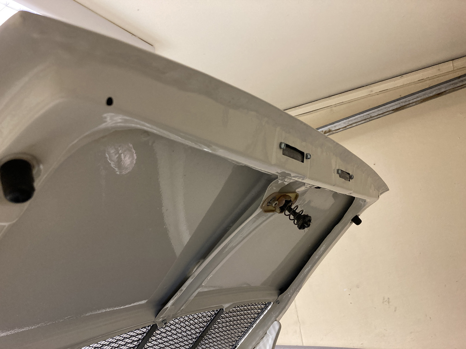 Har ju också lagt igen hålen för listerna som är original på kofångare fram och bak. Där ska jag ha en 25 mm bred stripe. Tejpade en rand med 25 mm tejp för att få den rätt. Lurigast för att jag har ett så litet garage. Fick öppna upp och sticka ut häcken för att kunna få lite distans.