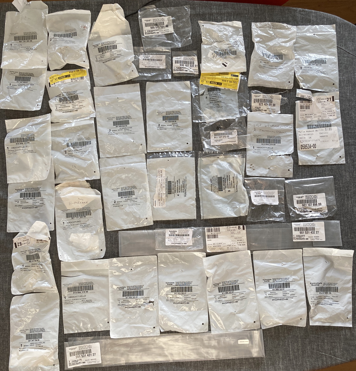 När jag städade garaget så fanns det en hel del Porsche-original förpackningar. Här ser ni en bråkdel. Många delar i en bil...