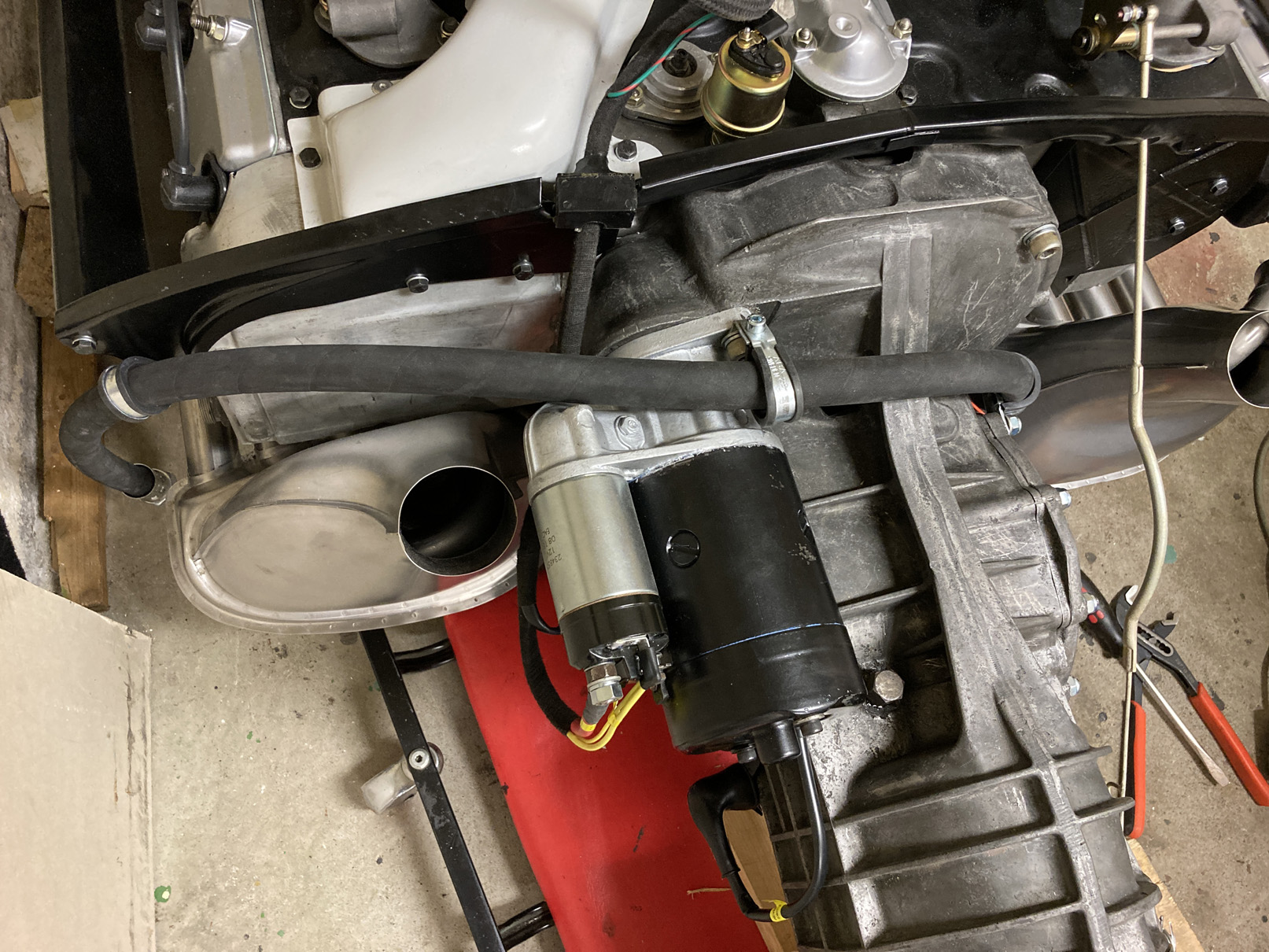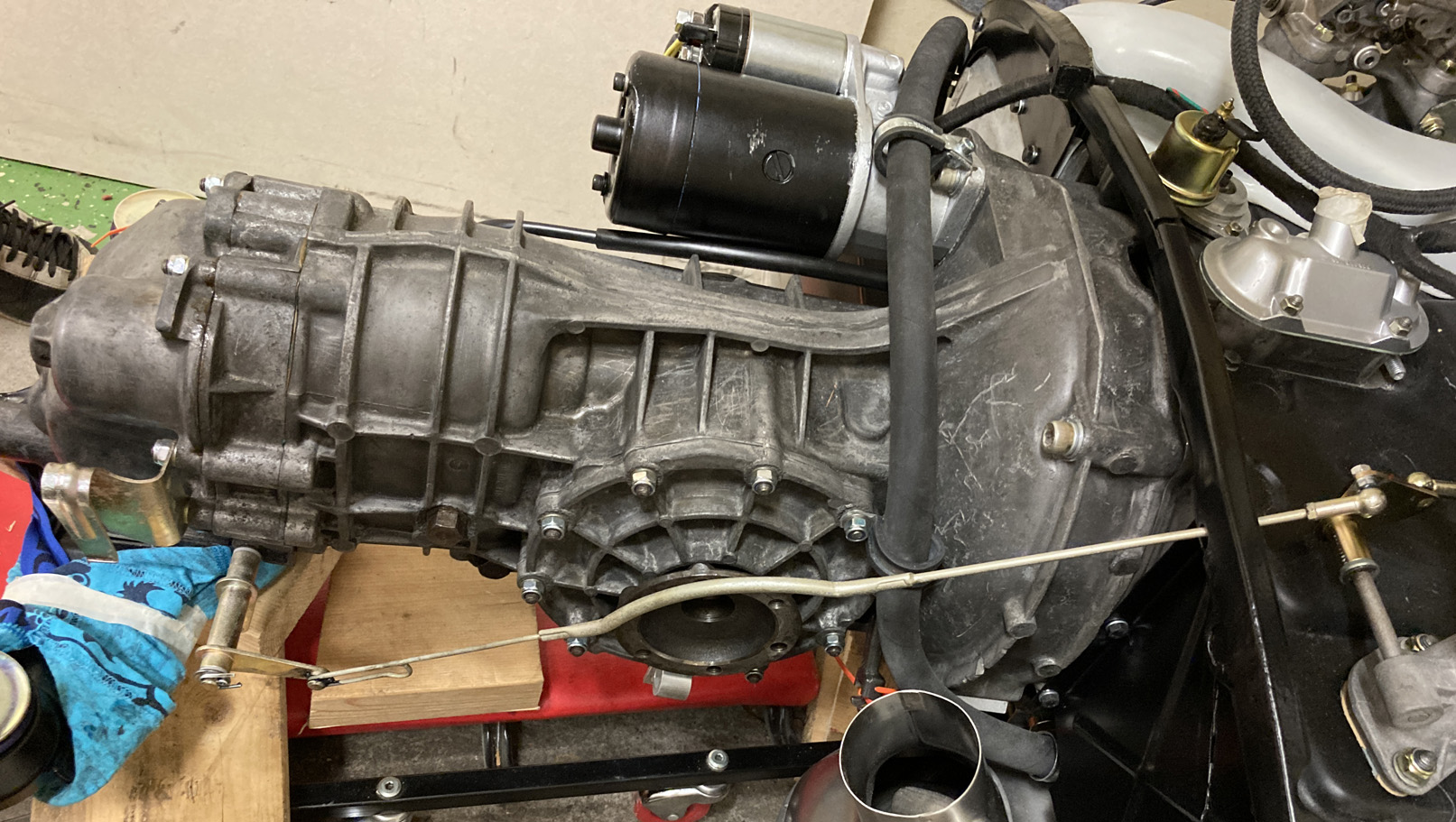 Förutom kablage till startmotorn så sitter switchen för backlamporna där på samma sida. På andra sidan så går länkaget till förgasarna. Det är ett antal kopplingar och hävstänger. Den som sitter längst fram på växellådan kopplas ihop med gaswiren under bilen. Kollade så att allt löper fritt till ytterlägena.