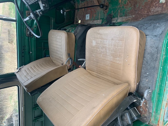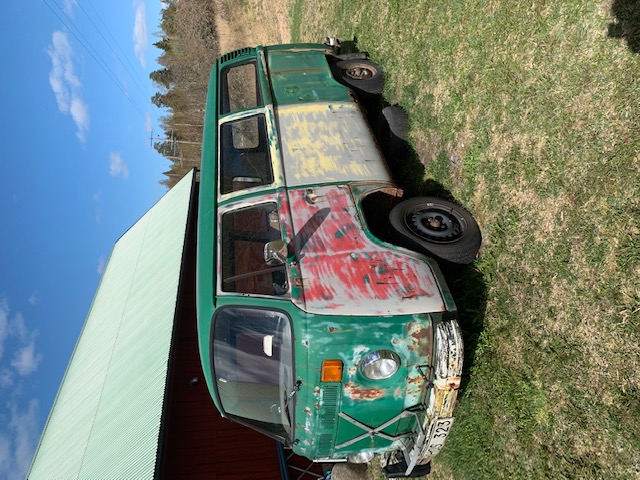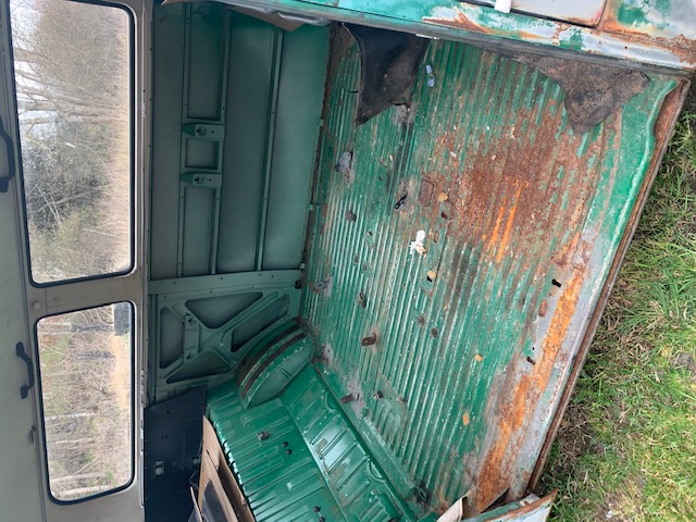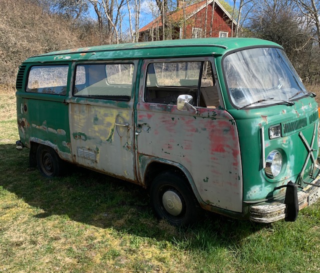 Motor går runt men ej startad. Framstolar finns. Ok skick, inget baksäte. Har varit campinginredd och ventilations hål i taket som är igenlagt.