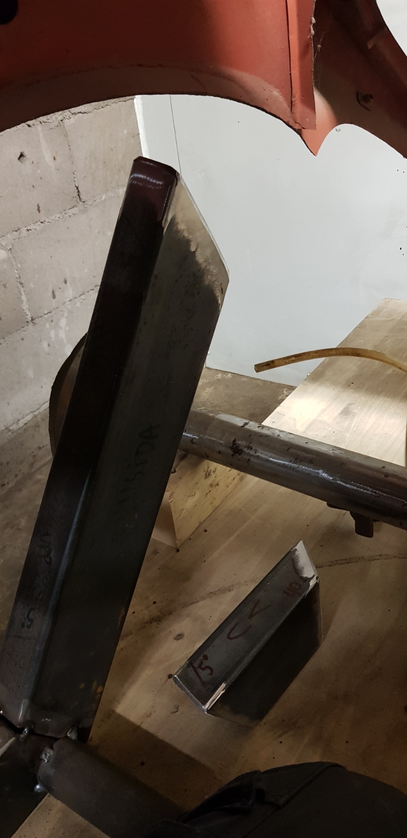 I tvärbalken (läs bockad 4mm plåt) kommer sedermera ett fäste att formas parrallelt med ramen. Lite svårt att förklara i ord  ICQ/bs