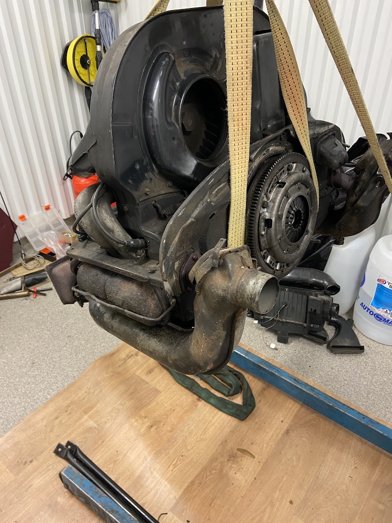Motorn startade och fungerade men sölade olja mest överallt så den tog vi ur rätt så omgående för att lämna iväg på renovering medan vi höll på att blästrade och svetsade ny plåt på karossen.