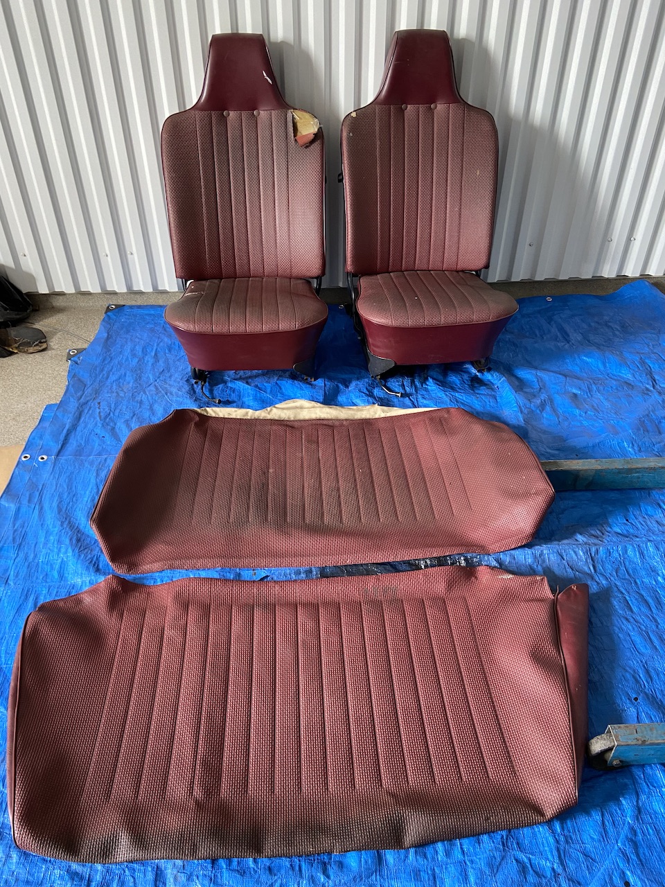 Under tiden har jag klätt av överdragen på stolarna och framstolarna har fått ny sitt-stoppning och slipning och målning av stols-underredena.