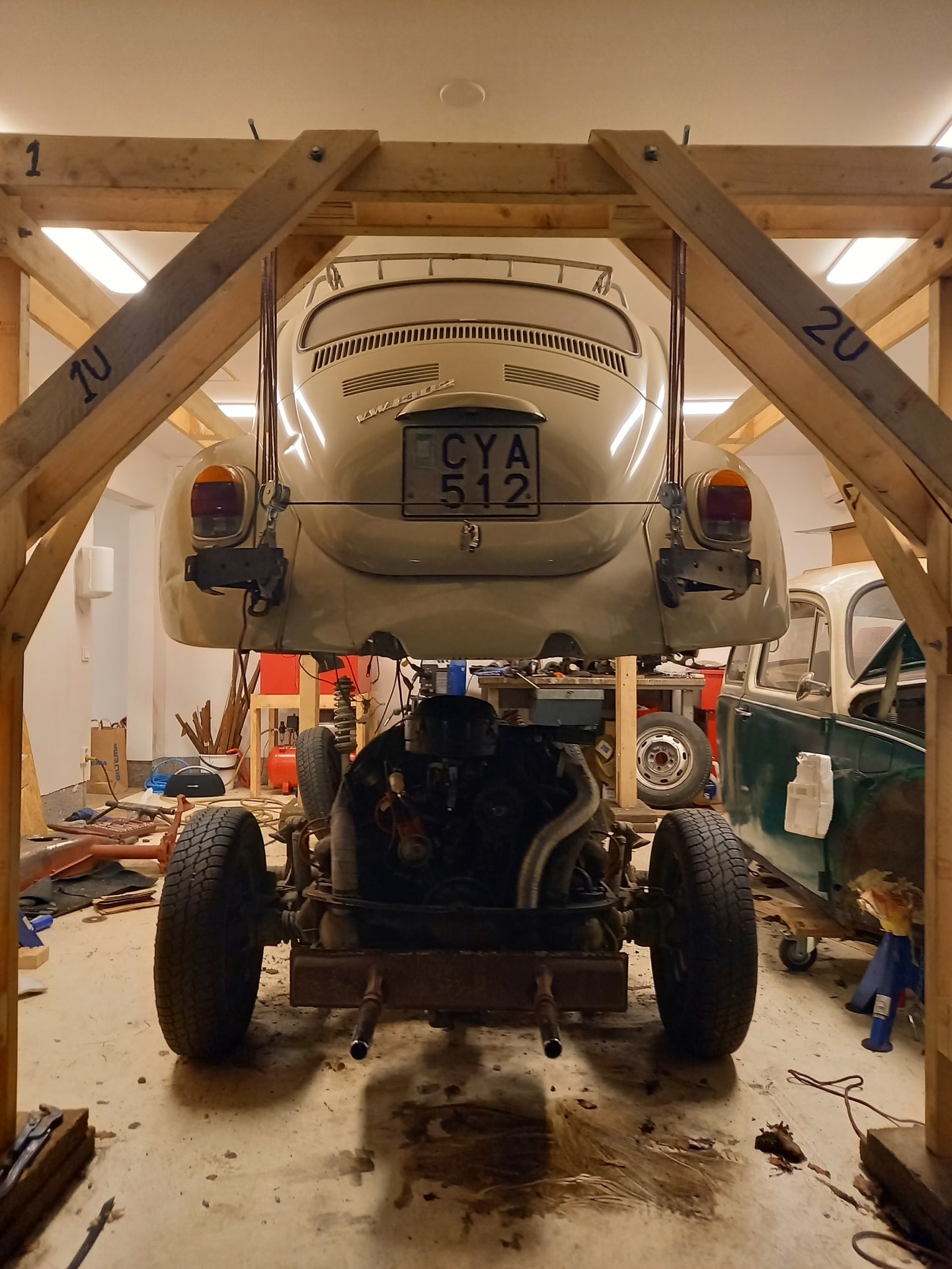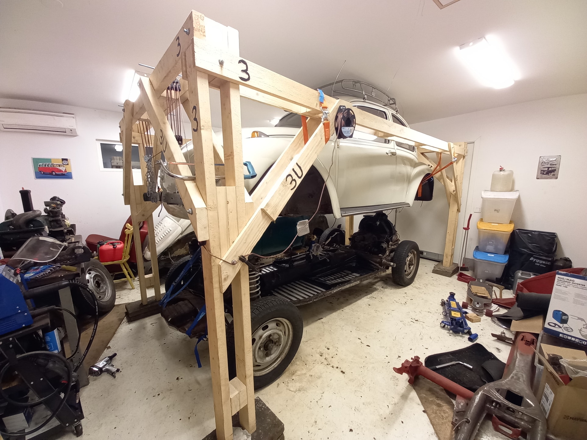 Min typ 1 1302:a från -71 gick inte igenom besiktningen i höstas pga rost på bärande delar. Jag började skära bort gammal plåt och upptäckte att jag skulle behöva separera chassit och karossen för att de inte de skulle bli hopsvetsade när jag lagade. Dessutom var det bara en tidsfråga innan jag skulle behöva göra det pga annan rost. Jag byggde en trälift så jag kunde lyfta karossen med block och talga: