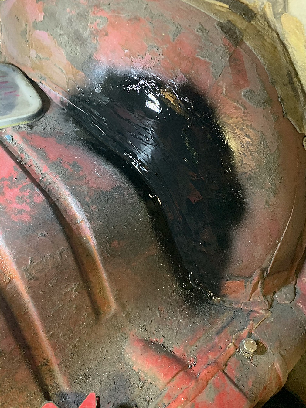 Körde med roterande stålborste i vrålapan och i lilla tryckluftsslipen. Sedan tvättade jag och målade på rostomvandlare.