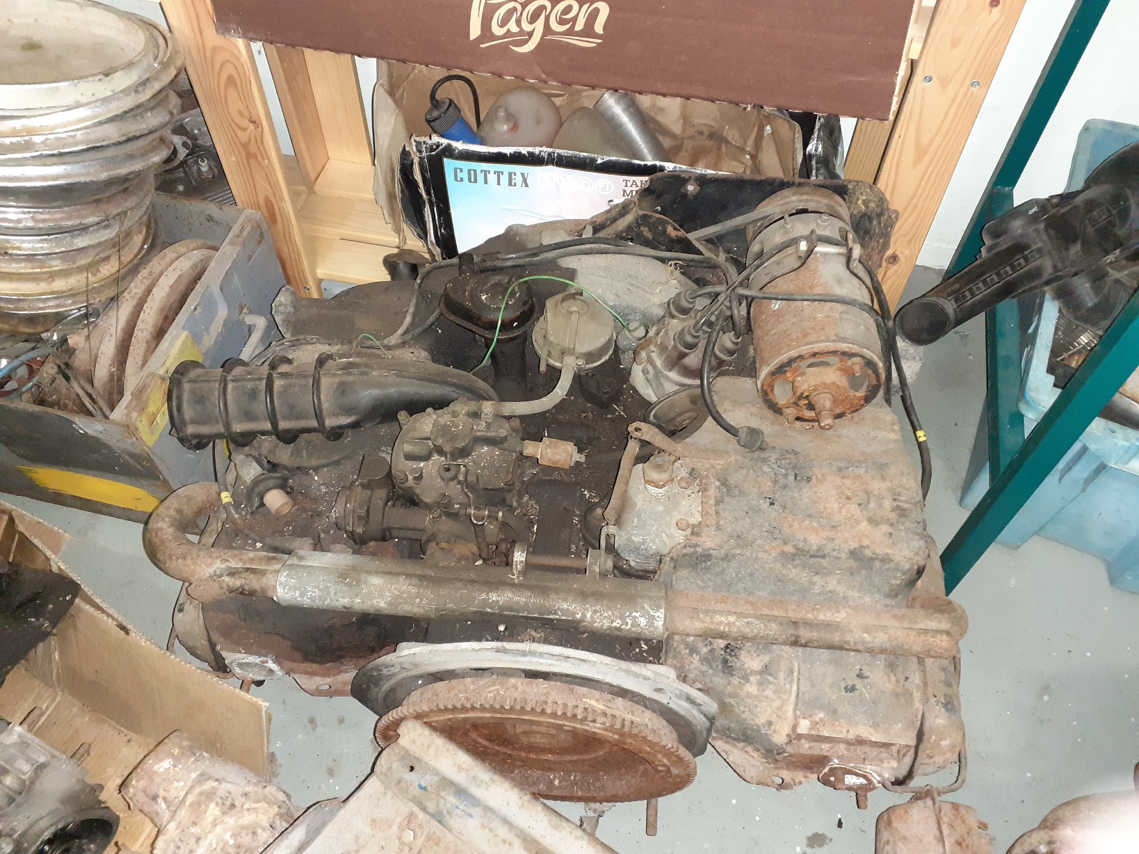 Nicklas svarade rätt. B motorn typ2 1968-70. Typ 3 motorn med enkelförgasare är troligen 1963-66 (startkransens kuggar). De tidiga typ 3 har ett insug med anliggning mot topparna som ser ut som på 34hk 1200 motorerna. Det sitter en 70-tals fördelare på den som inte samarbetar som den skall med förgasaren.