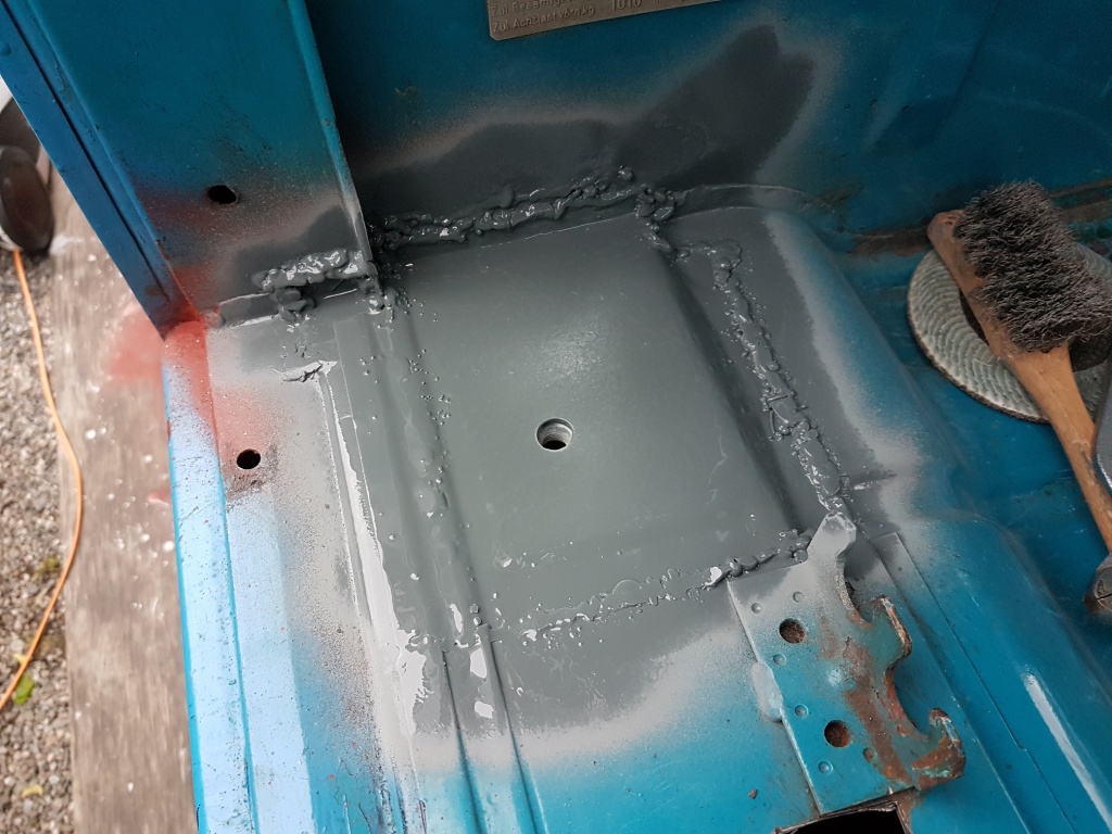 Svetsade igen borrhål i golvet och med detta var golvet helt hållöst, vilket det inte varit under hela mitt ägarskap så det känns bra. Svetsade ihop ett värmerör jag var tvungen att såga isär för att komma åt bättre och rostskyddsmålade de nya plåtarna på undersidan. Golvet kom väl till användning och jag vet inte vad som skall göras med det som blev över, kanske säljer det till bättre behövande, men det blir när jag är 100 procent färdig med plåtjobbet.