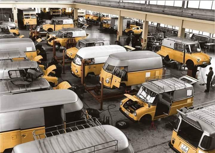 På bilden från service garaget syns en typ 1:a, undrar hur dessa, som bla Deutsches Bundespost använde var utrustade på insidan. Någon som vet?