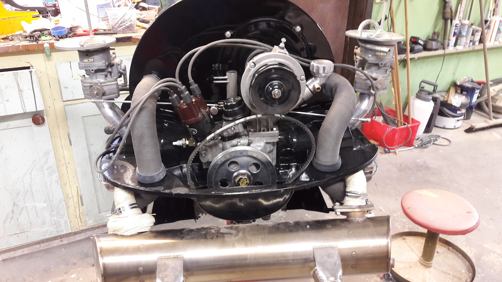 Motor: fullflow utanpåliggande oljefilter. Motorbild visar innan fullflow monterats. Arborrat, toppar 35/40, kamaxel 100, lite lätt trimmat alltså. Dubbla Solex Kadron. Renoverad förra året.