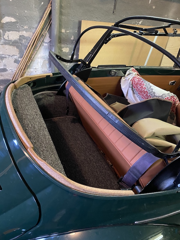 Men jag blev inte nöjd med hur innertaket blev ut mot sufflettspetsarna så jag började om med att fästa innertaket med skruven som sitter i handtaget för cablåsningen. Fortsatte sedan med att spänna ut innertaket mot suffflettspetsen så det blev jämnt och rynkfritt, spikade fast det längst ut.