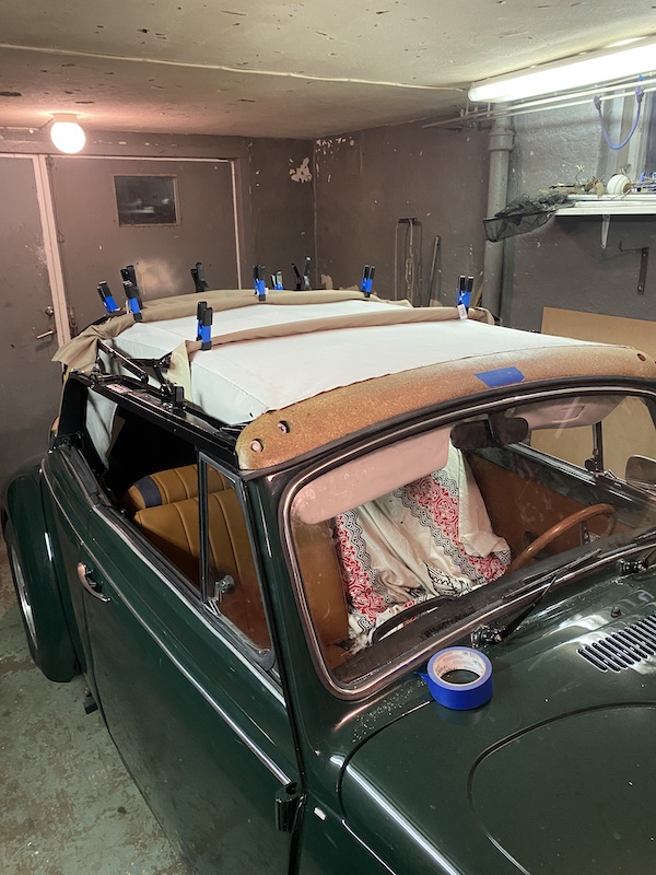 Men det var bara att ta tag i det, limmade sedan fast innertaket i ramen, bit för bit så det satt, klämmor, klämmor och åter klämmor.