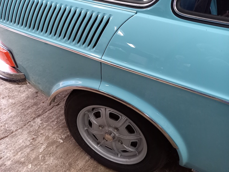 Söker den blanka (rostfritt stål) dekorlisten på skärmkanten bak till vänster sida. Listen är likadan på 411 & 412.