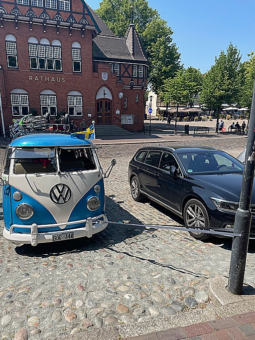Bilden med förtöjningen är från Tyskland, det är en riktigt brant parkering. Syns dåligt på bild. Har man dålig handbroms så får man förtöja, det är sen gammalt.