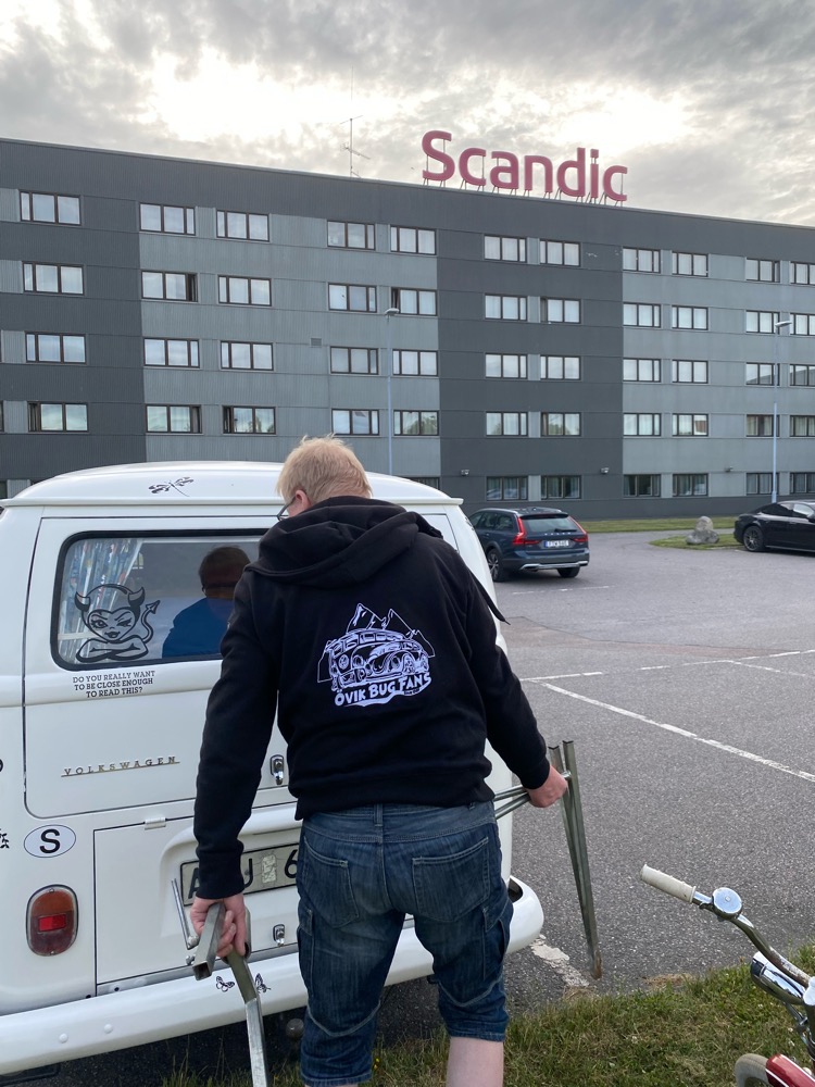 Som tur var fick jag lift av en trevlig man i en soltak oval. Han bor i byn där dom landstiger och har en riktigt fin kärra.