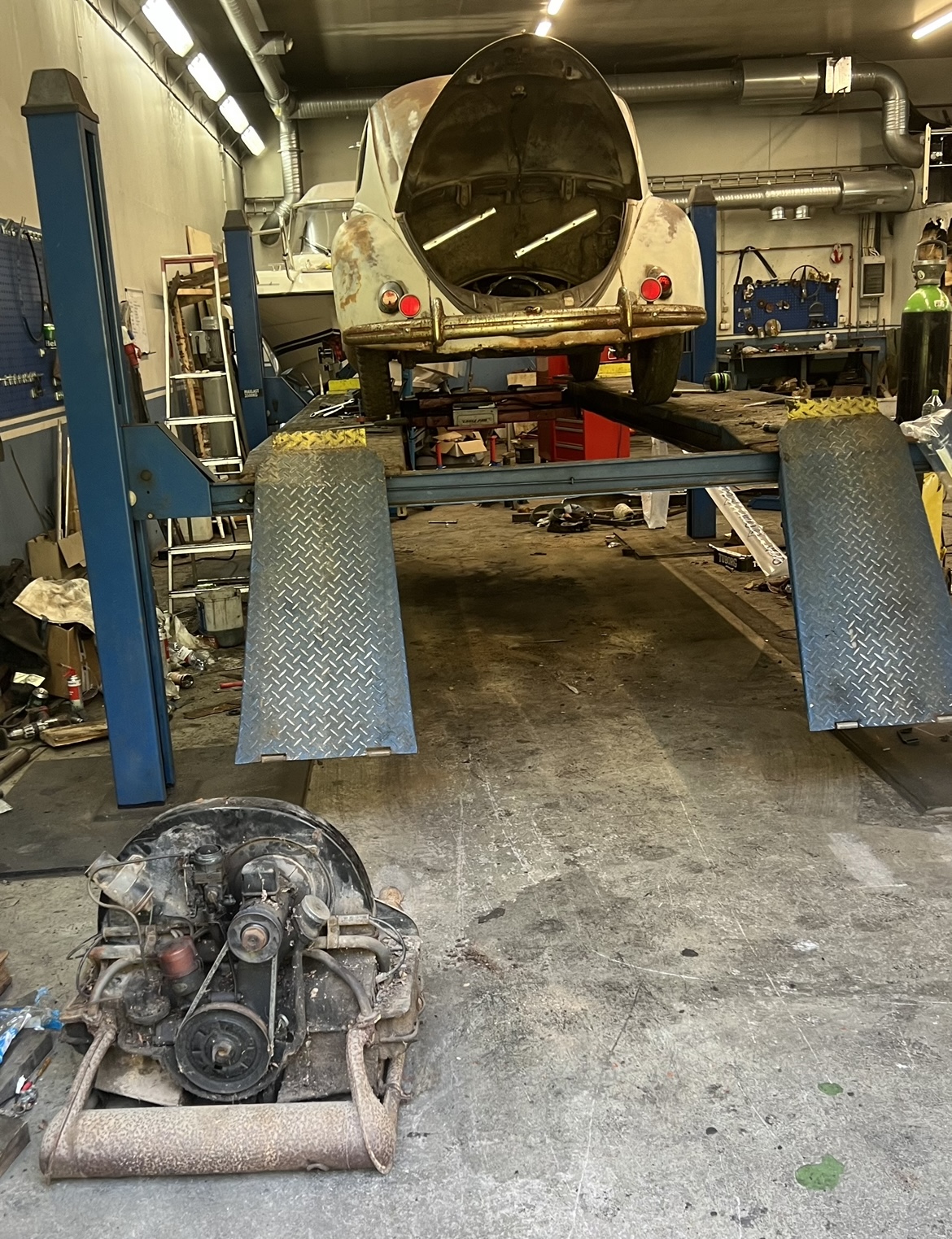Jag har lyft ur 25hk motorn då den va helt stum, tyvärr va det utbytesmotor så jag har inte orginalmotorn till bilen. Först tänkte jag stoppa i en 34hk motor, men fick tag på en 1985 1600 (46hk) industrimotor med 86 timmar på timmräknarn. Så efter lite jämförande med orginalmotorn så bestämde jag mig för den istället. Idag kom den på plats och det passade riktigt bra efter lite modifieringar. Har endast tagit fläktkåpan från orginalmotorn. Dom andra plåtarna är från 1600an och en slut 1300 jag har så jag slapp kapa i några orginalgrejer. Ska se om jag får liv i den i helgen så jag kan flytta den för egen maskin.
