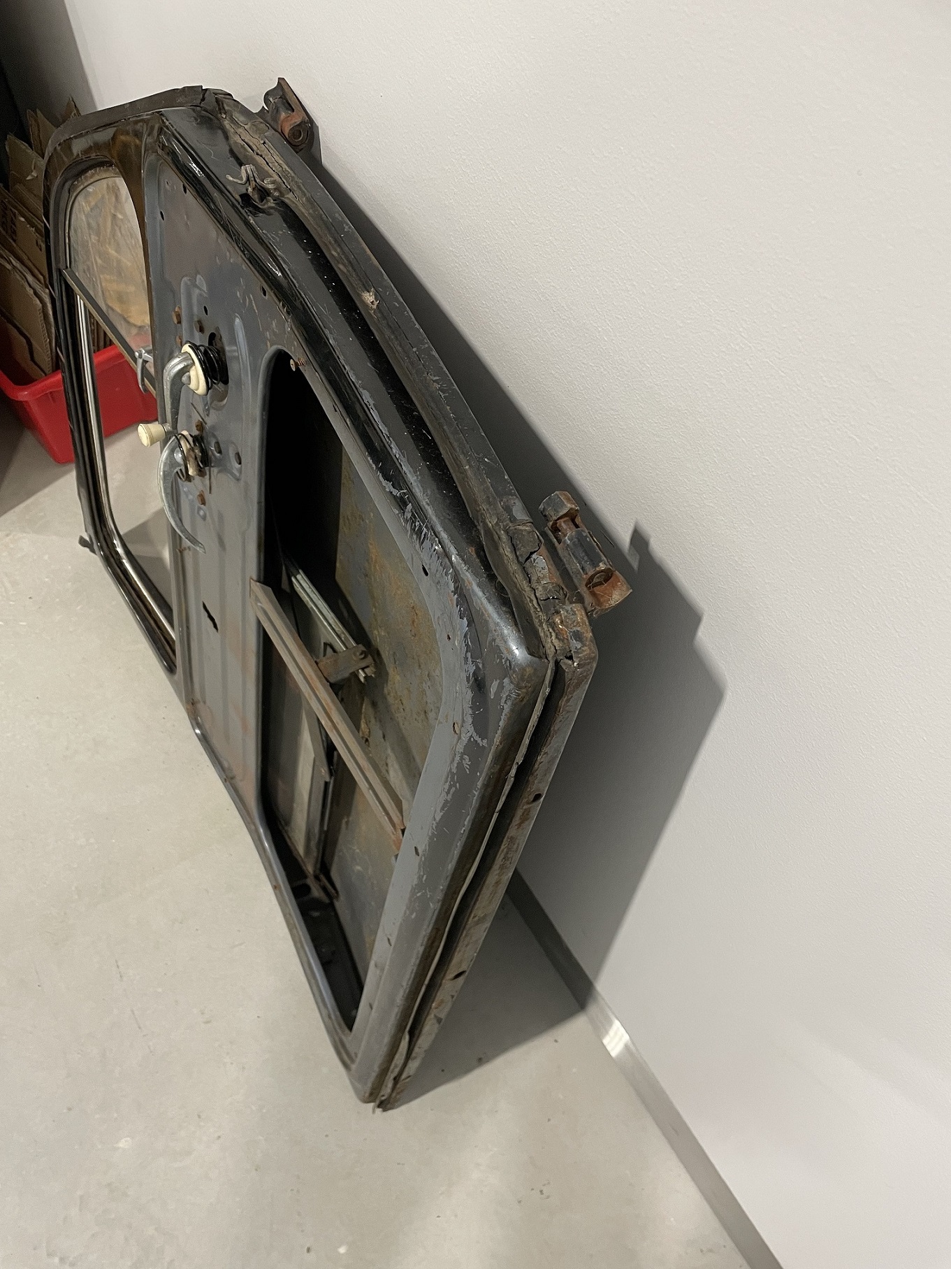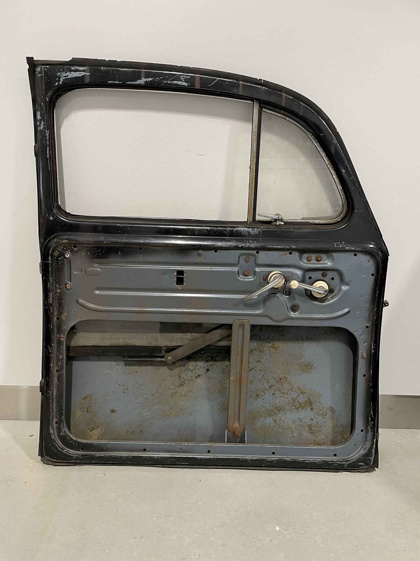 Passagerardörr i fint skick, originallack stratossilver men ommålad i svart. Med fönsterhiss och ventilationsruta. Båda gångjärnen är kapade och måste bytas. 2000:-