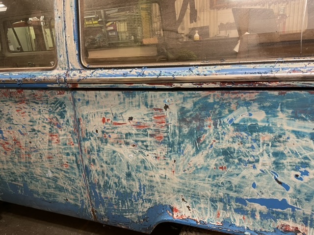 bilen målades av min far med enkomponent industrifärg, roller o pensel . . . ganska tjockt skulle jag säga. bilen tappade definition i linjerna, såg bara svullen ut. sen är där många ställen där det blivit hål i "lacken" o rosten börjat krypa, om än ytligt, måste åtgärdas innan det går för långt. o så body under färgen ca 20 cm nederst på karaossen . . . som, just det, är omlackad tre (eller fyra??) gånger redan tidigare