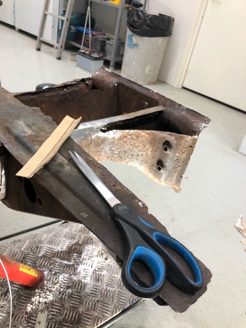 Fick med nya balkar för golvet bak så jag bytte till de nya då de gamla var för dåliga. Kändes skönt att få montera något nytt på plattan efter all demontering. ICQ/bs  Blev även tid till att börja börja passa in nya plåtbitar i ram huvudet.Sen blev det kvällen..