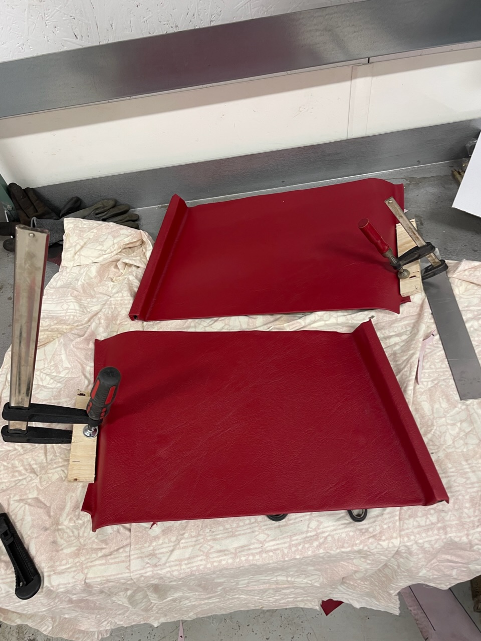 Har även jobbat med inredningen. Byggt egna sidostycken bak. Plåt som kläddes med röd vinyl.