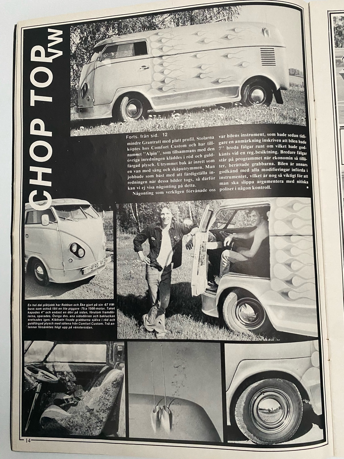 Riktiga customs har inte byggts många i Sverige under senare år konstigt nog, men med den 50 - 60-tals nostalgi, som även drabbar oss, kommer också gamla customs eller nya med gammaldags modell fram i ljuset. Två Stockholmsgrabbar, Robban Clausnitzel och Åke fredefors byggde sej en custom som skulle presenteras för första gången i samband med årets upplaga av hot Rod Show. Vagnen man utgick från var en -67 VW-buss. En hel del karossjobb utfördes som naturligtvis var ganska tidsödande. Det jobb som tog medta tiden var sänkningen av taket med 4" vilket gav bilen en helt ny profil. Både Robban och Åke tyckte att bussen hade alldeles för många dörrar så man svetsade igen bakluckan och ena sidodörren. De nya profilerna i karossens nederkant bockades till i plåt innan de svetsades dit. Robban framhöll också att ingen plast alls har använts under ombyggnaden utan allt har tennats upp på gammal god custombyggarmanér. Helt klart var det också att framlysena skulle vara dubbla snedställda, som skulle sänkas 10 cm. Själva lysena fick grabbarna tag på hos K.G. Knutsson och de var egentligen avsedda för en traktor. Baklysena försänktes också, likaså ett par antenner vis takkanten på ena sidan. När man var någorlunda nöjd med plåtjobbet var det dags att lägga på lack. Robban höll i sprutan och lade på silverflake med tonade orange-gula flammor efter sidorna.