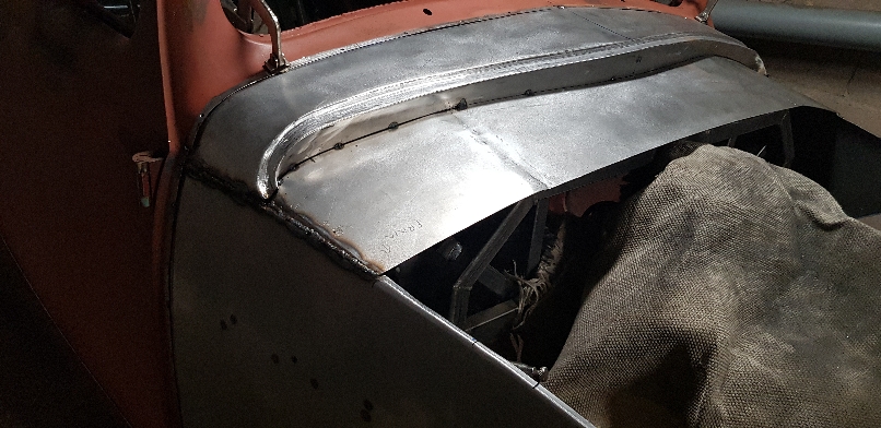 Nu är de framdelen runt torpeden som ska få sig lite plåt, så jag börjar med plåten mellan huv och kaross på ovansidan. Skärde till och rulla en plåt passlig i grovt först. Sickade/falsade konturen på huven med en försänkning, och lika så mot kaross sidan.