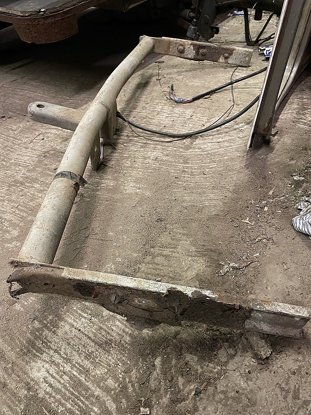 Det gäller ett gammalt drag från en typ3. Själva draget är ganska fint, galvat och helt. Litet rosthål vid ena infästningen. Den rosten som syns på infästningarna annars är lite av bilen som är kvar. Man behövde nog inte så mycket verktyg när det demonterades  ICQ/bm  ICQ/ag