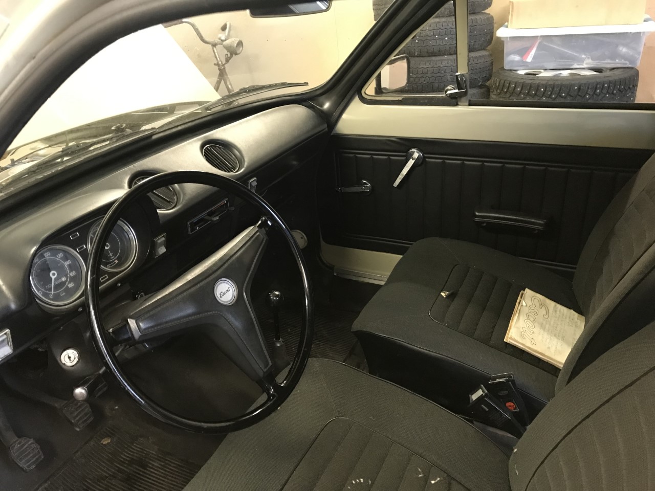 Svart inredning i lite slitet skick, dock inga hål i dörrsidor, ej sprucken instrumentbräda och innertaket är fint.