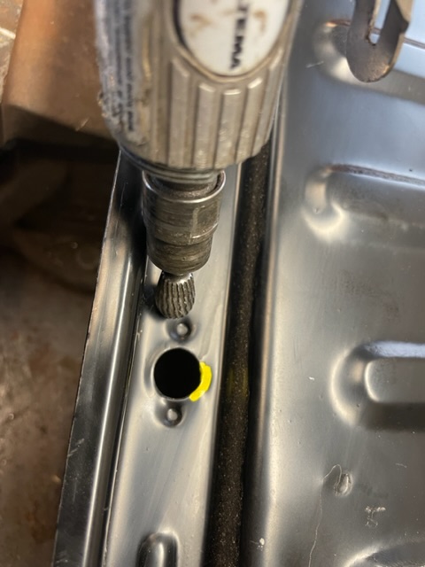 Sedan preppades golvplåten med en hålstans och slipades plåtren vid hål/kant. Bara tre gjorda på bilden å ej slipat än.)