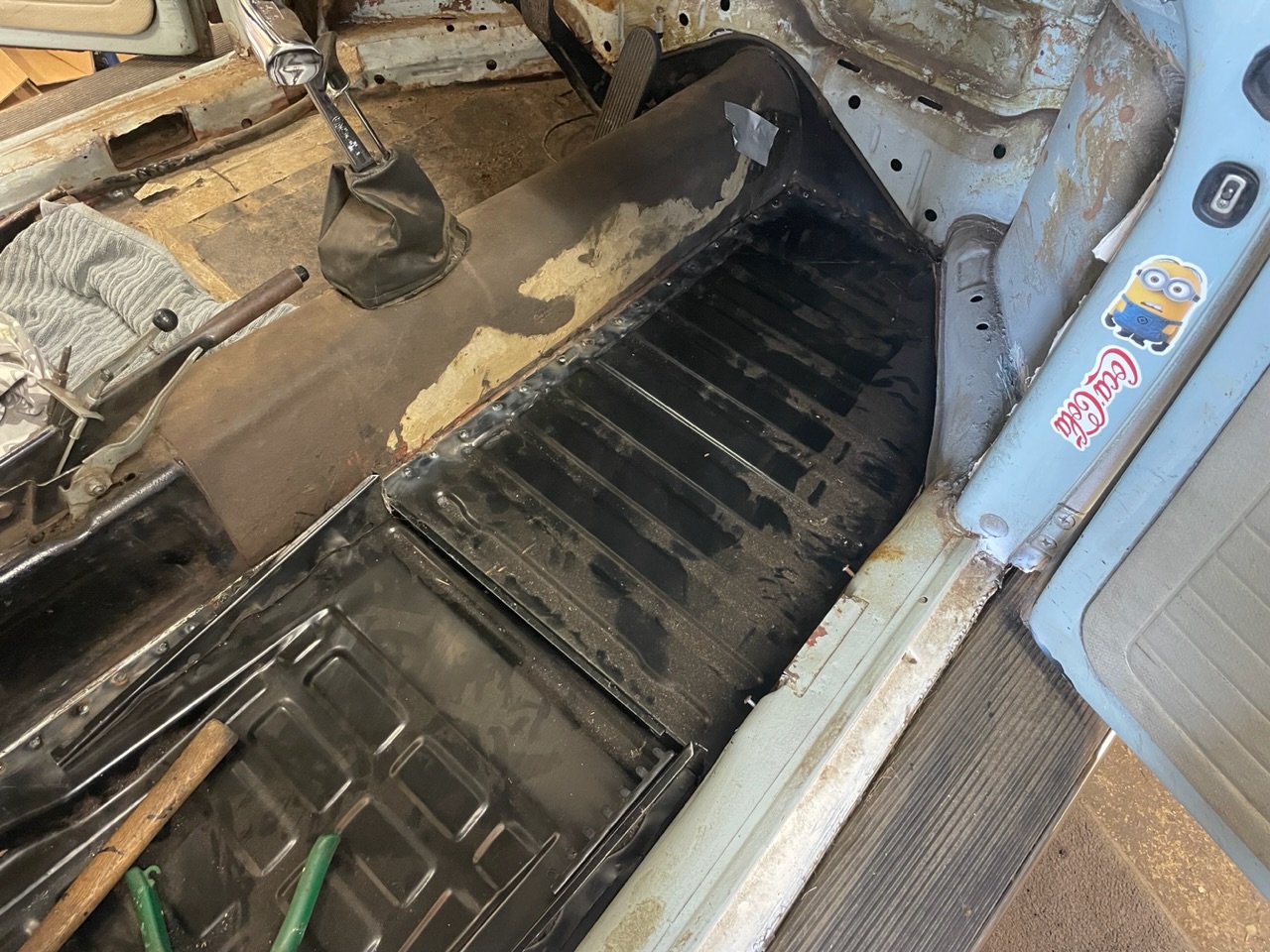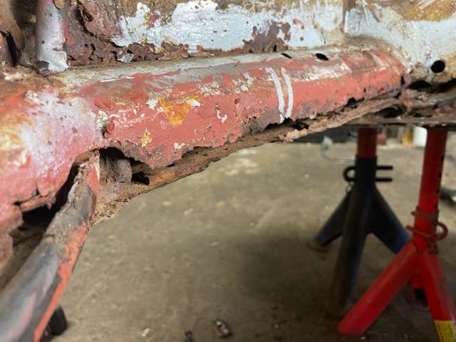 Vänster är främre tröskel skadad men bak betydligt bättre än vad trodde. Lätt att laga när golvet är borta.