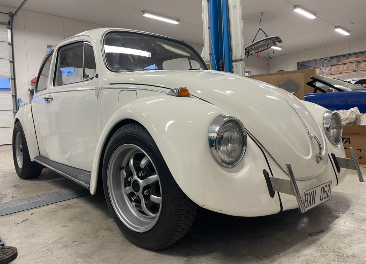 Tog ett litet ryck och nu är den klar för besiktning. Tryckte i ett nytt rör i förgasaren å service olja å nya stift å nu går den. Bytte hjul till KPZ och med 1500 låda med 205/70 -15 bak går den med väldigt lågt varv. Fyran är nästan överväxel!