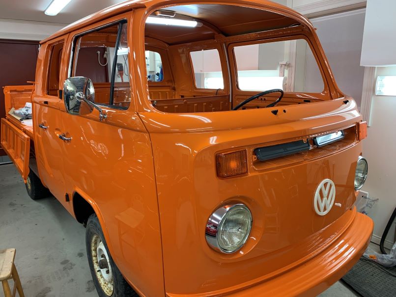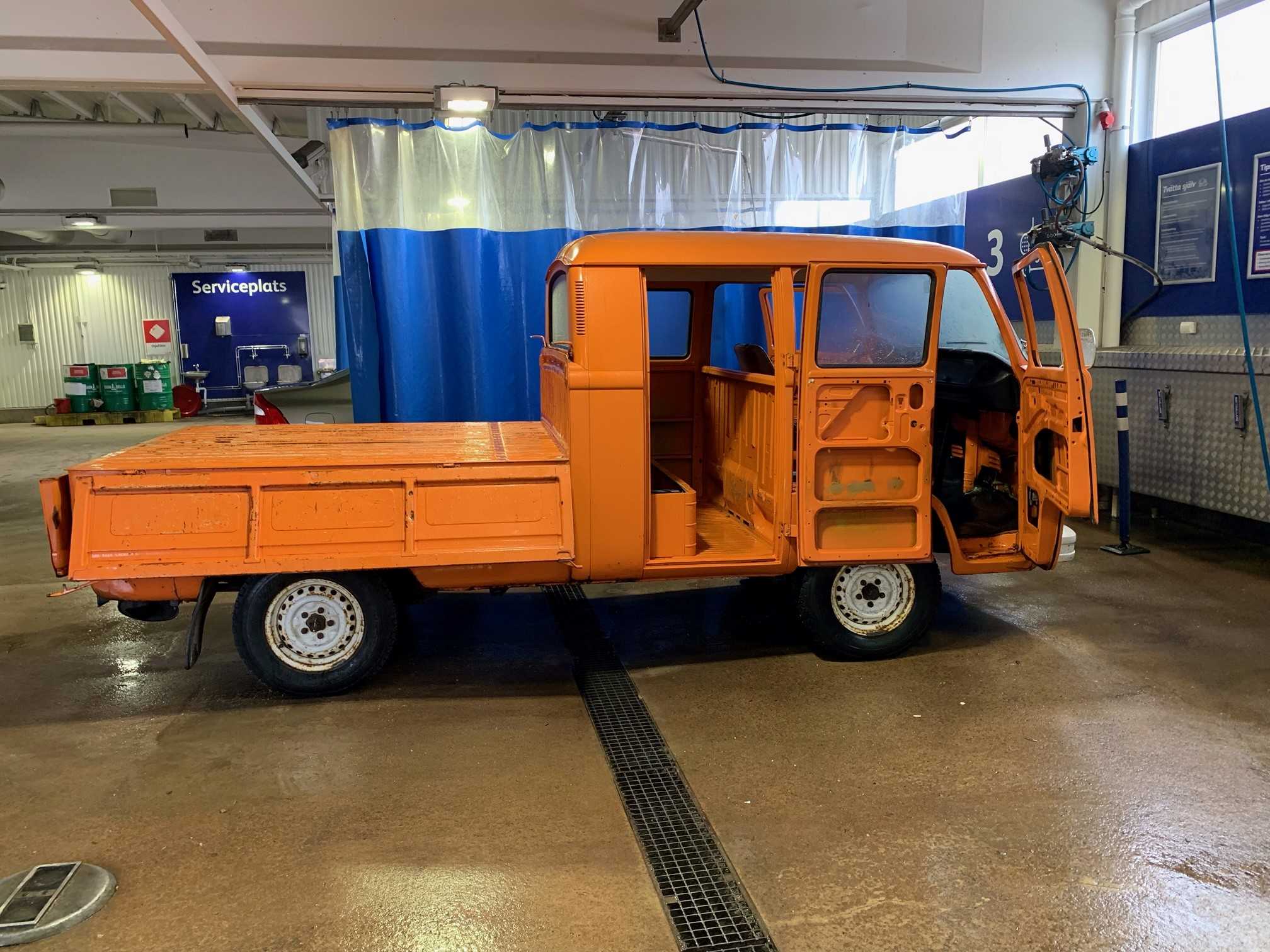 I våras startade tillsnyggningen av Dubbelhytten. Den har stått utan motor under perioden 1983 - 2020 så karossen är i väldigt gott skick och med väldigt få skador. Dessvärre så var ju rostskyddet och lackeringen av dessa bilar enklast tänkbara, så en mängd stenskott mm hade satt sina spår. Den hade under en ganska kort period även stått utomhus, vilket den klarat ganska bra, men bakre flaklämmen var dålig. Förmodligen har regnvatten runnit under den vilket har gjort att den rostat. Den fick bytas mot en ny, som av någon märklig anledning var 15 mm kortare än den gamla. Nu har minsta antydan till rost åtgärdats, vilket är ett omfattande arbete även på en bil som i det närmaste kan sägas ha varit rostfri. Lite rost på höger bakskärm, lite vid fotstegen och även lite på golvet vid förarplatsen, men inte mycket mer. Men som sagt, bilen saknar i princip rostskydd.
