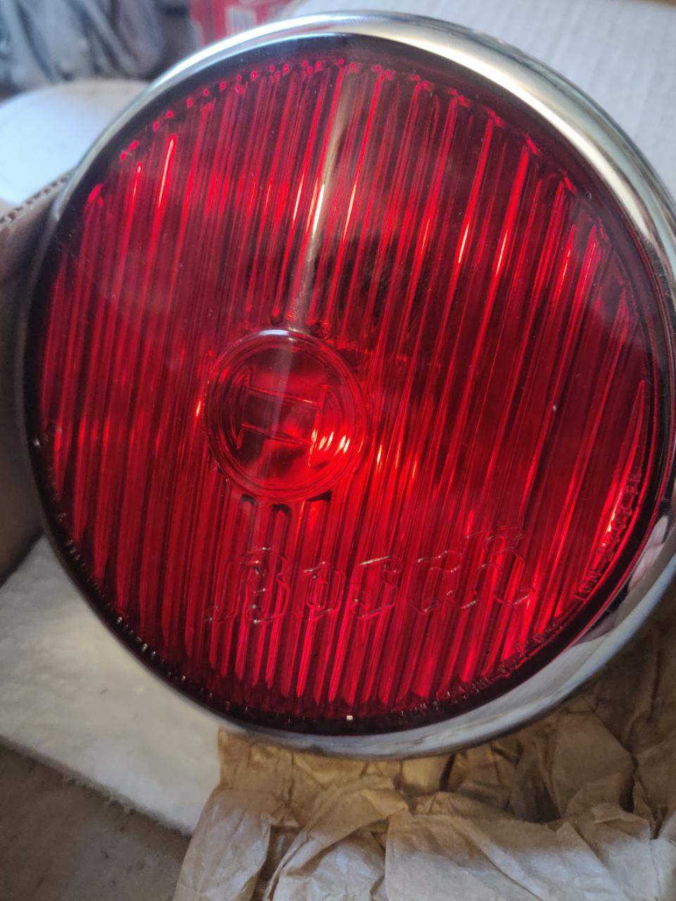 Bosch röd tillbehörslampa, kan förslagsvis användas som extra bromsljus eller dimljus. Lampan är helt ny NOS i kartong, medföljer gör också beskrivning och monteringsdetaljer diametern är 13cm.