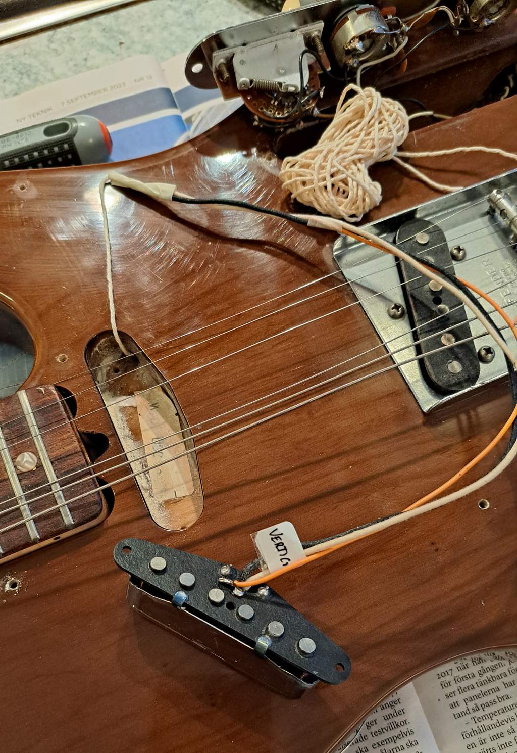 Med skalpell pillade jag bort den sandwich av dekaler som satt både i halsfickan och på halsen, och förpassade dessa till en påse med originalgrunkor. Den rejält krockskadade switchen byttes ut mot en repro. Stallsadlarna byttes mot "intonerade" i mässing, och volympoten (original på 1M - hur tänkte de i Fullerton egentligen???) byttes mot en snällare.