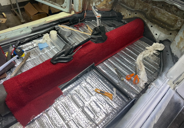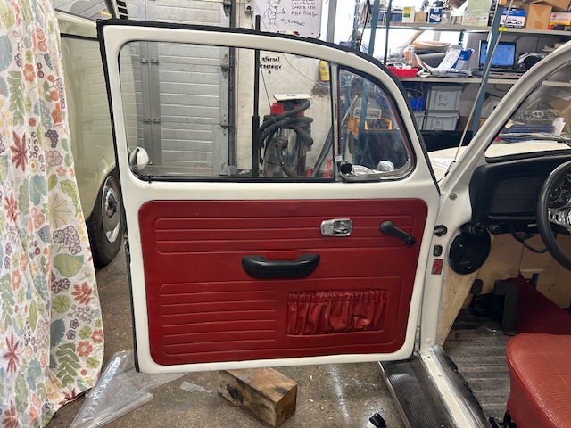 Inredning har påbörjats med klädsel av tunnel och det blir röda dörrsidor. Skitiga säten som ska rengöras mer. Riktigt bra kommer de aldrig bli med detta är en snik-looker.